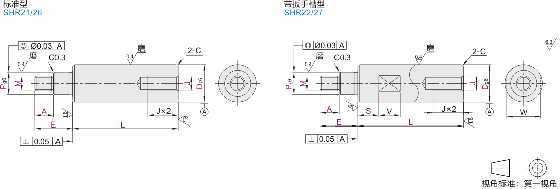| SHR21 | 标准型 | g6 | GCr15 | SUJ2 | 高频淬火 有效硬化层深度见P16 淬火硬度 GCr15 HRC56~ 9Cr18Mo或同等硬度耐蚀钢 HRC52~ |