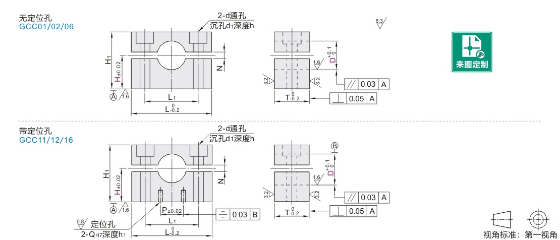 紧凑型导向轴支座 分离型 无定位孔 带定位孔 机加型 分离式夹紧固定型 安装孔沉孔