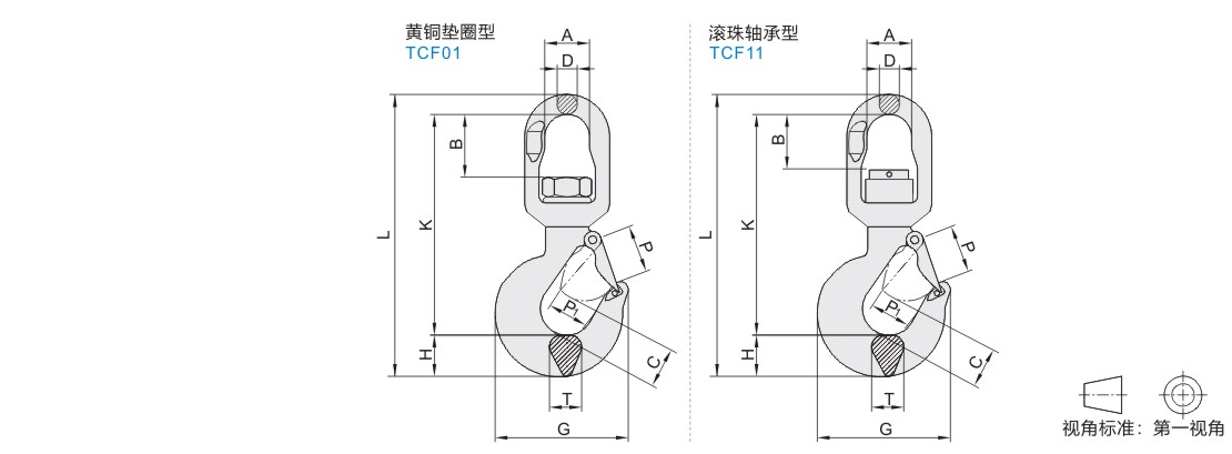 ● TCF01带黄铜垫圈型吊钩是一种定位装置,在负载的情况下不可旋转;