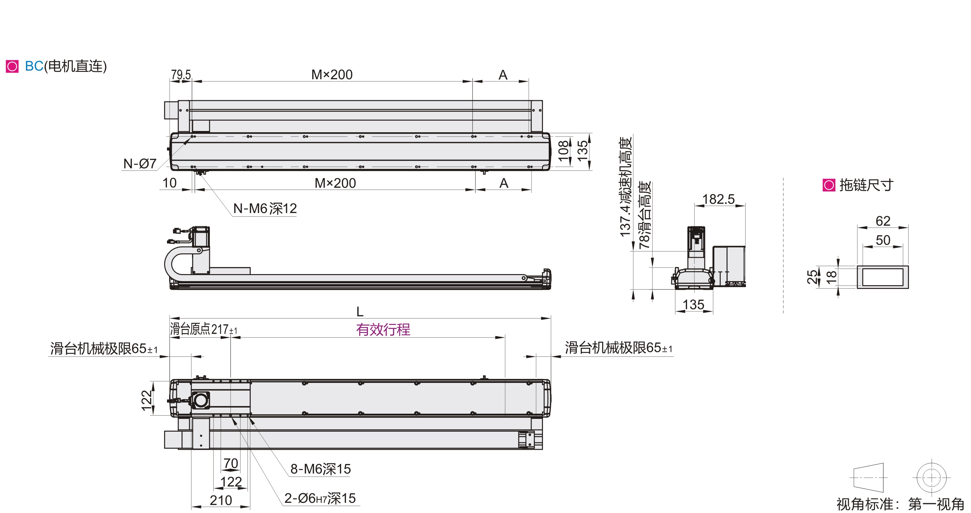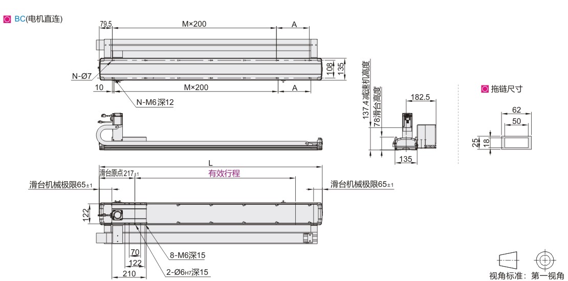 | Mxd | 485N.m | 说明: 1.实际负载需满足以下条件: (a)满足"详细参数表"中最大负载条件 (b)满足"容许力矩表“中力矩条件 如超出条件使用将大幅降低滑台寿命 2.表中数据以额定寿命10000km为基准。 3.表中重复定位精度为单方向数值。 4.滑台额定加速度0.3G,短行程滑台可 能无法达到最高速度。 5.滑台如果竖直使用,请选择带刹车电机。 |