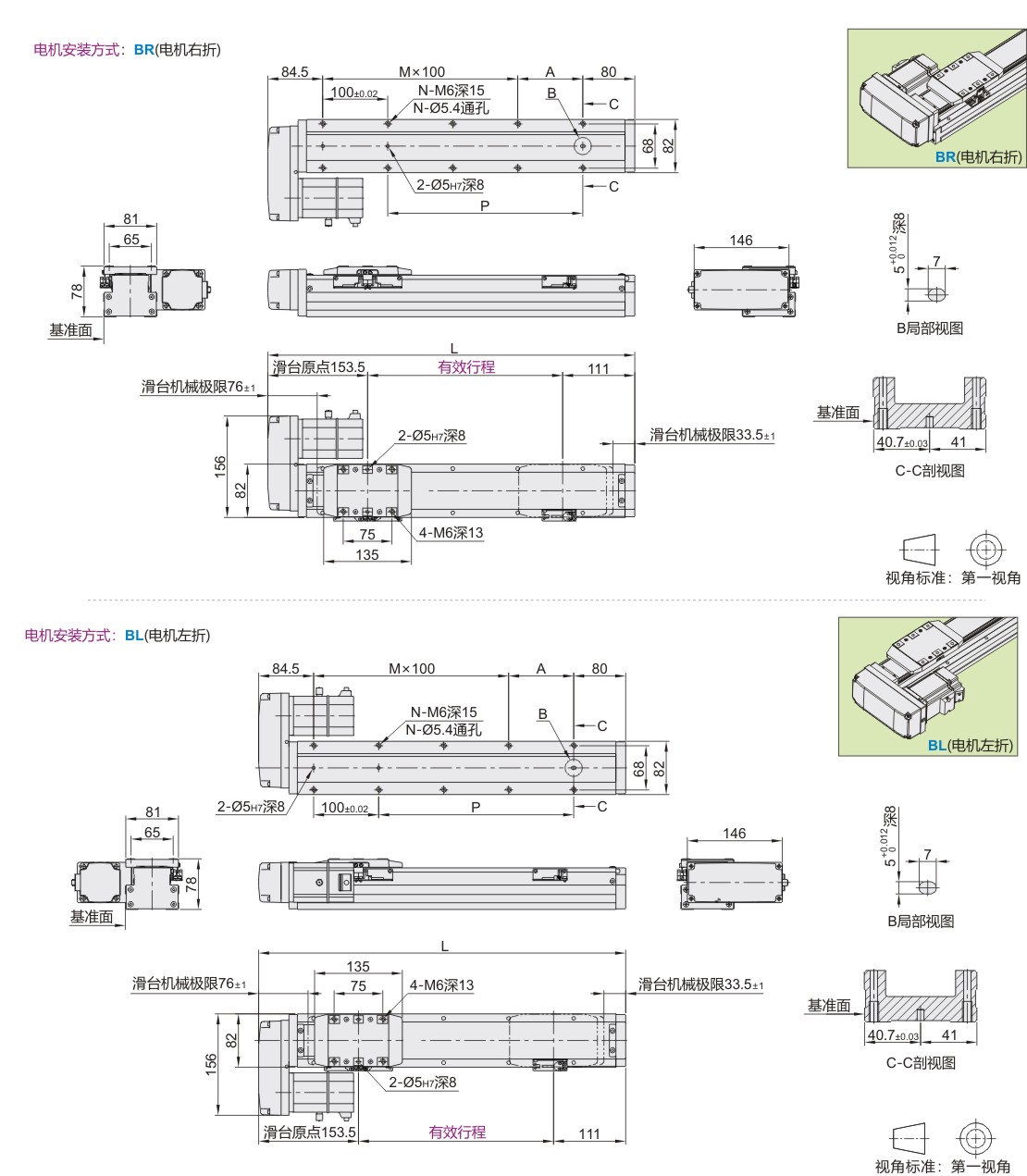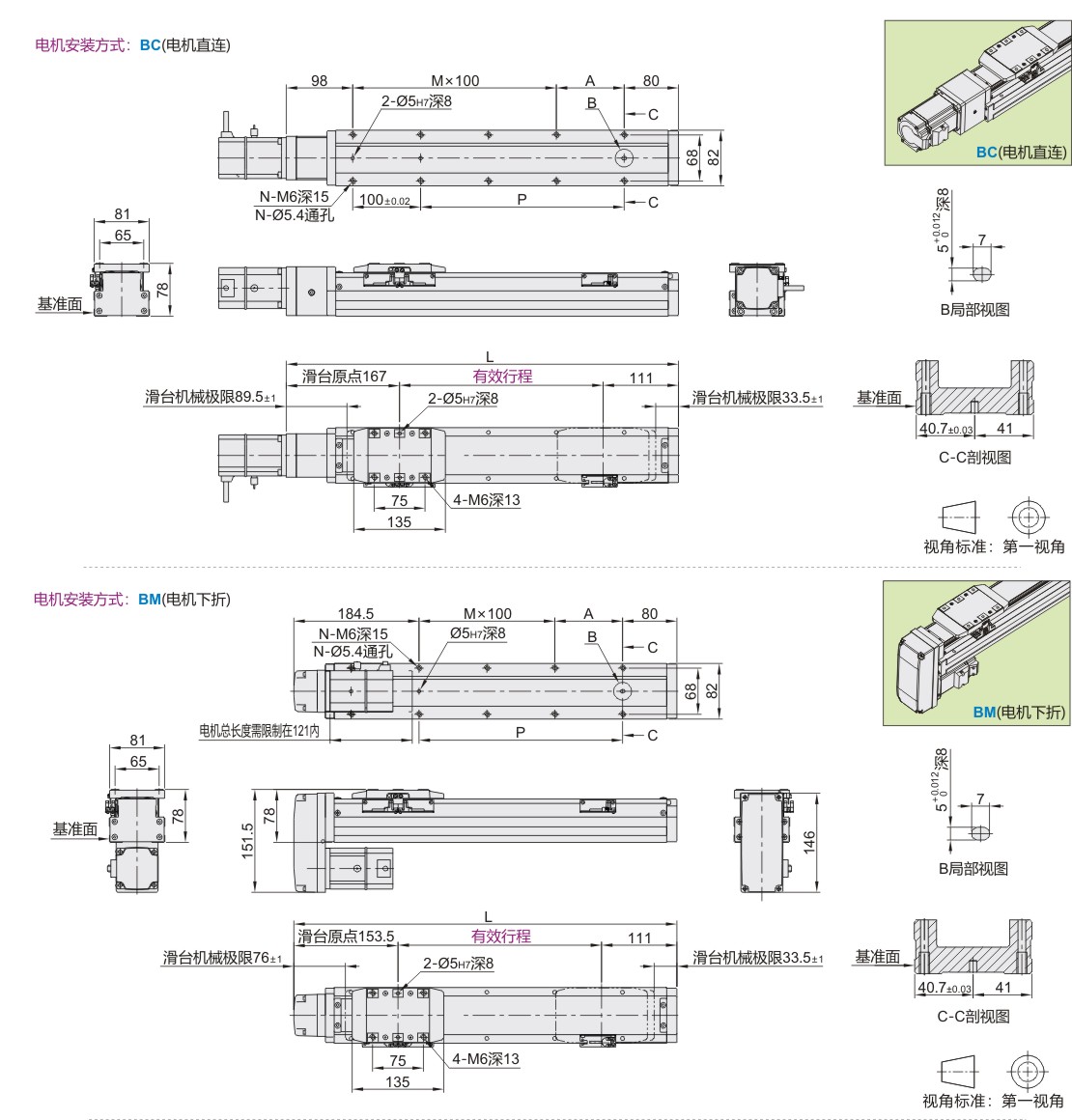 | Mxd | 626N.m | 说明: 1.实际负载需满足以下条件: (a)满足"详细参数表"中最大负载条件 (b)满足"容许力矩表"中力矩条件 如超出条件使用将大幅降低滑台寿命 2.表中数据以额定寿命10000km为基准。 3.表中重复定位精度为单方向数值。 4.丝杠传动型滑台达到一定行程后,最高速度 需适当降低。以免滑台发生共振,影响使用 寿命。 5.滑台额定加速度0.3G,短行程滑台可能无法 达到最高速度。 6.滑台如果竖直使用,请选择带刹车电机。 |