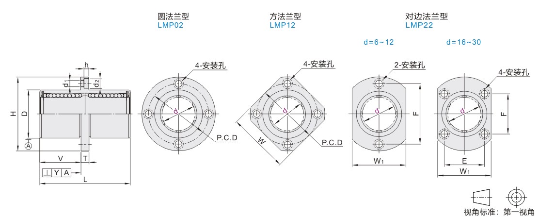 LMP02 中型 圆法兰型 GCr15 SUJ2 56HRC~ 无电解镀镍 GCr15 树脂 丁腈橡胶 -15~80℃
