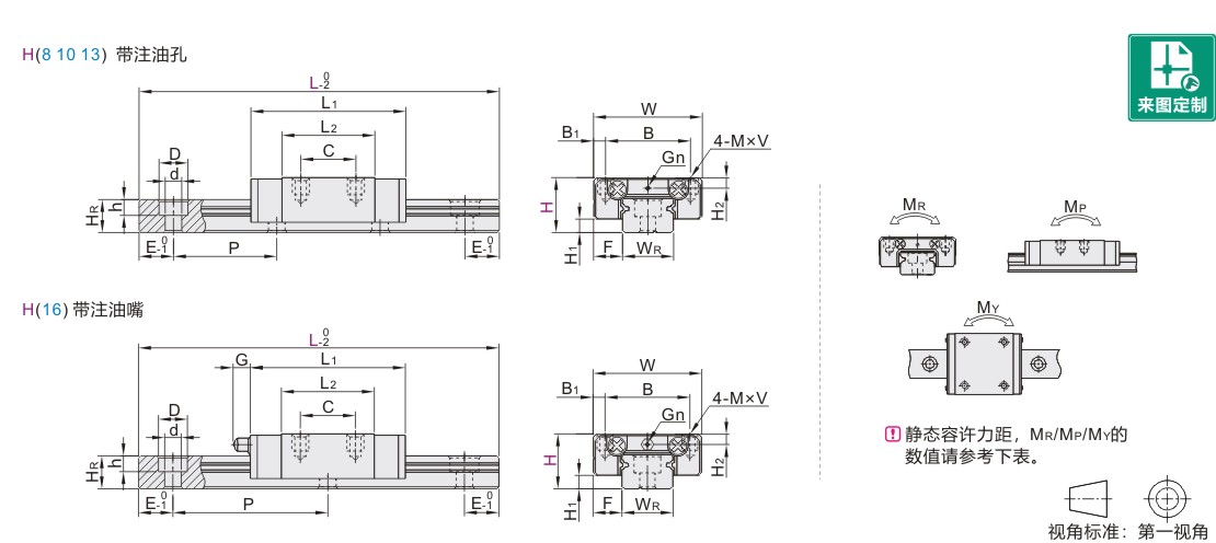 滑块数可在型号后+“-B*”,如“IAC01-H8-L200-B4”表示配4个滑块,但轨道长度不得小于滑块组装后总长度(含油嘴)。