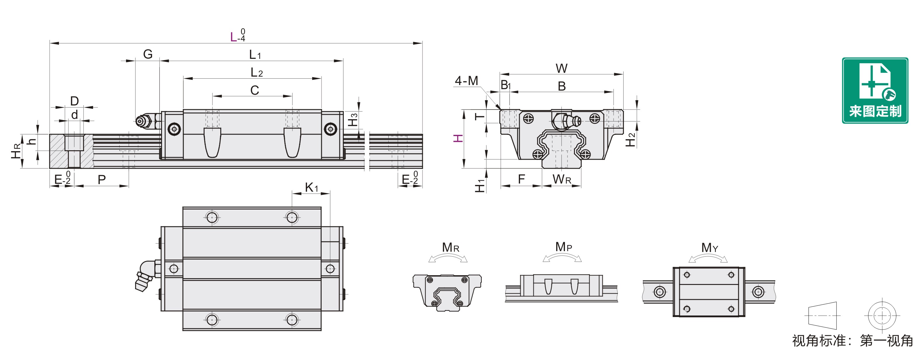 | WR | HR | D | h | d | P | 固定螺钉 | C(动) | Co(静) | MR | MP | MY | 滑块(Kg) | 滑轨(Kg/m) |