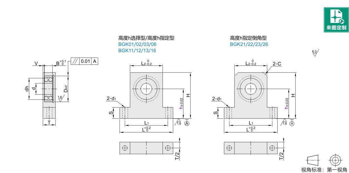 怡合达自营 带座轴承 轴承座组件 机加型 标准型 单轴承 T型 高度h选择型/h指定型/h指定倒角型 调心球轴承