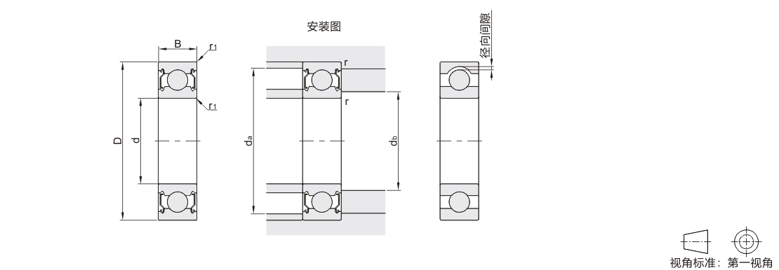 基本额定负载 | 容许转速 | 挡圈尺寸 | 安装尺寸 | 重量 (g) (参考) |