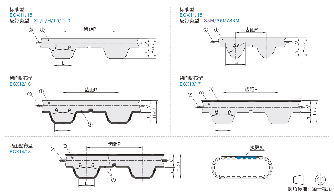 | 代码 | 齿型 | 齿距 | 2θ | L(Lr) | h | H | V | Ra |