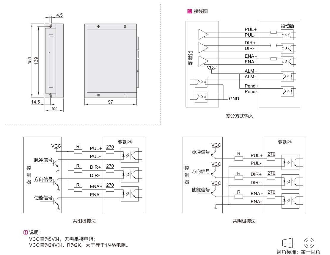 | 1 | PUL+ | 脉冲正输入 | 只支持5V, 5V以上需串电阻 |