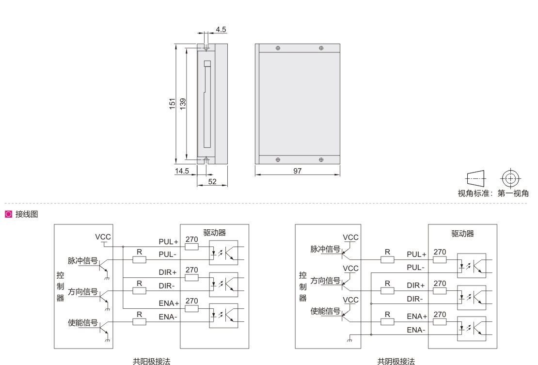 | DIR+ | 方向信号 :高/低电平信号 ,为保证电机可靠换向 ,方向信号应先于脉冲 信号至少 5μs建立 。电机的初始运行方向与电机的接线有关 ,互换任一 相绕组(如A+ 、A-交换)可以改变电机初始运行的方向 ,5V信号。 |