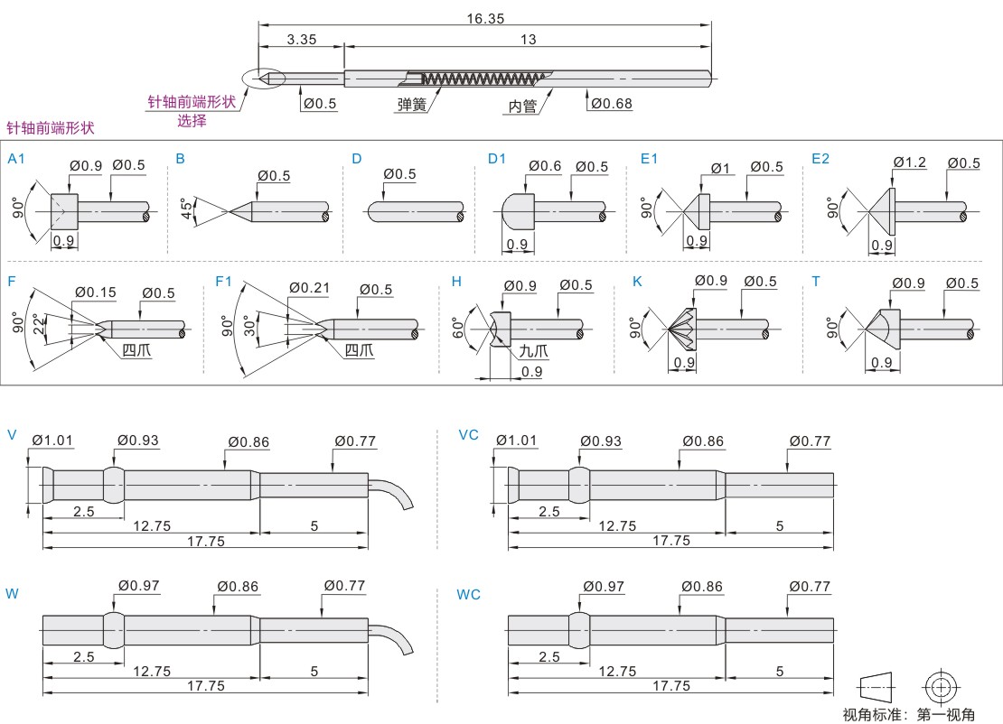 | 代码 | 类型 | 材质 | 表面处理 | 可选针套 | |||