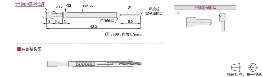 开关探针 带开关 最小安装中心距140mil/3.56mm 最大行程5.2mm