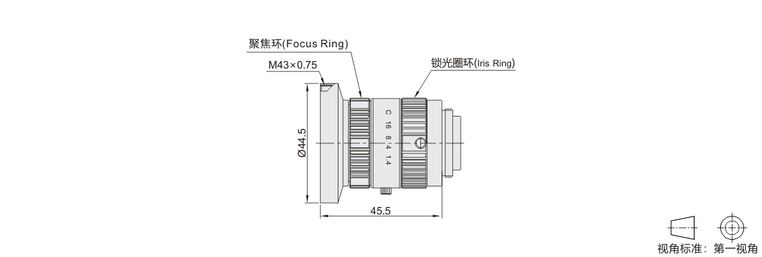 | H0514-MP2 | 5mm | F1.4-F16C | 100mm-900mm | -0.48% | -2.26% | M43×0.75 | Ø44.5×45.5 | 102 |