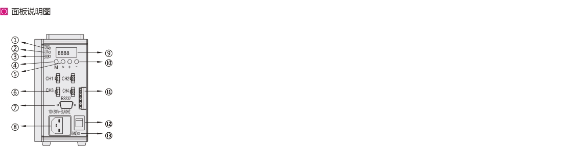 ⑥输出端口:CH1~CH2或者CH1~CH4为通道输出端,采用SMP-03V-BC接口,1:输出正3:输出负)
