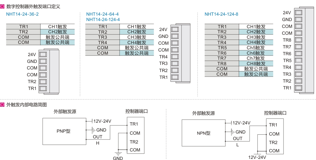 ⑪外部触发端口:COM为触发输入公共端,可正可负,TR1~TR4分别对应CH1~CH4通道触发输入的另一端