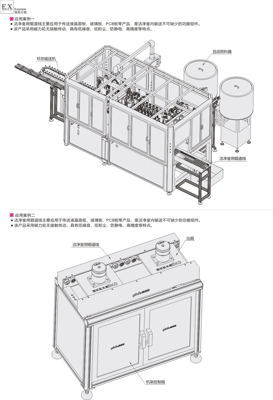 主要用于传送液晶面板 、玻璃板 、PCB板 、小托盘等要求低噪音 、低粉尘 、防静电的环境。