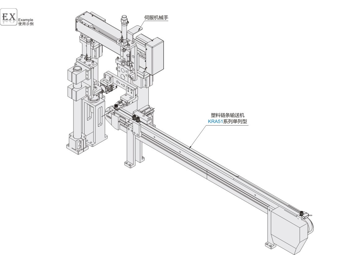 利用单列塑料链条输送产品累计传送下料,有摩擦力小,耐用,易维护,噪音小等特点。