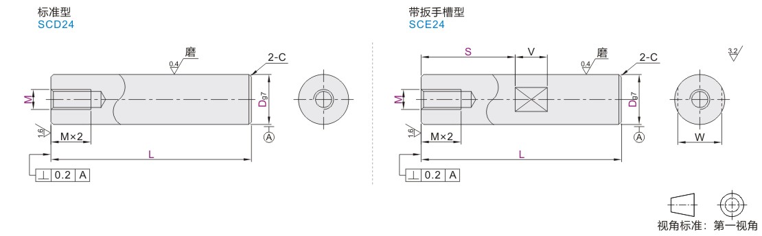 | SCD24 | 标准型 | 普通级 | g7 | 45 | S45C | 高频淬火 有效硬化层深度见产品简介 淬火硬度HRC56~ |