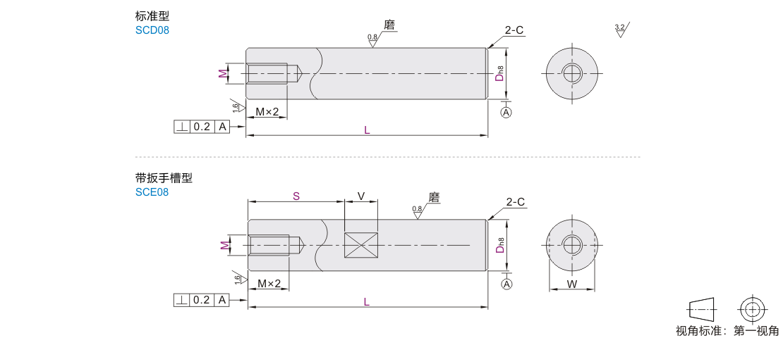 | SCD08 | 一端内螺纹型 | 标准型 | h8 | LY11 | A2017 | 黑色硬质阳极氧化,氧化层硬度HV450~,膜厚15μm~ |