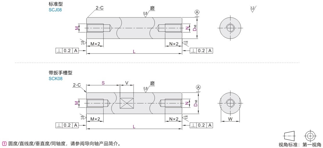 | SCJ08 | 两端内螺纹型 | 标准型 | h8 | LY11 | A2017 | 硬质阳极氧化,氧化层硬度HV450~,膜厚15μm~ |