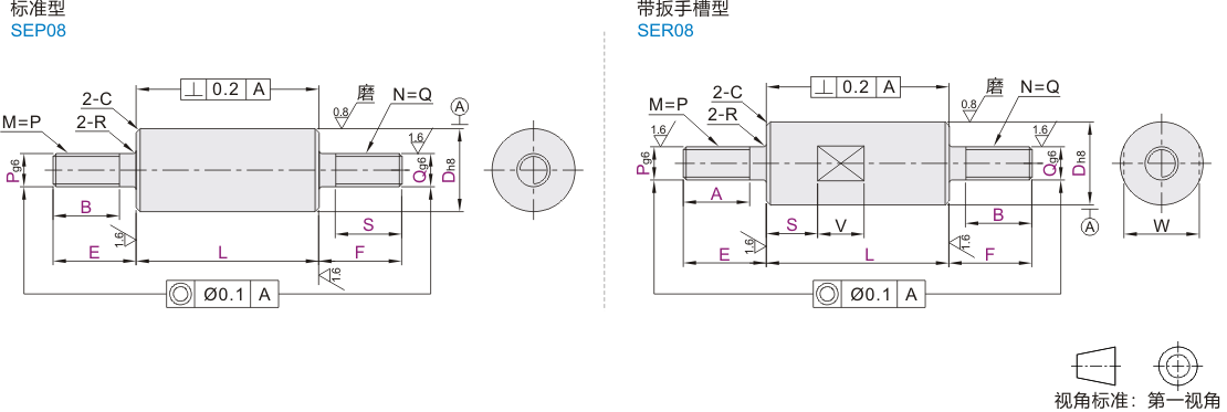 | SEP08 | 两端外螺纹型 | 标准型 | h8 | LY11 | A2017 | 硬质阳极氧化,氧化层硬度HV450~,膜厚15μm~ |