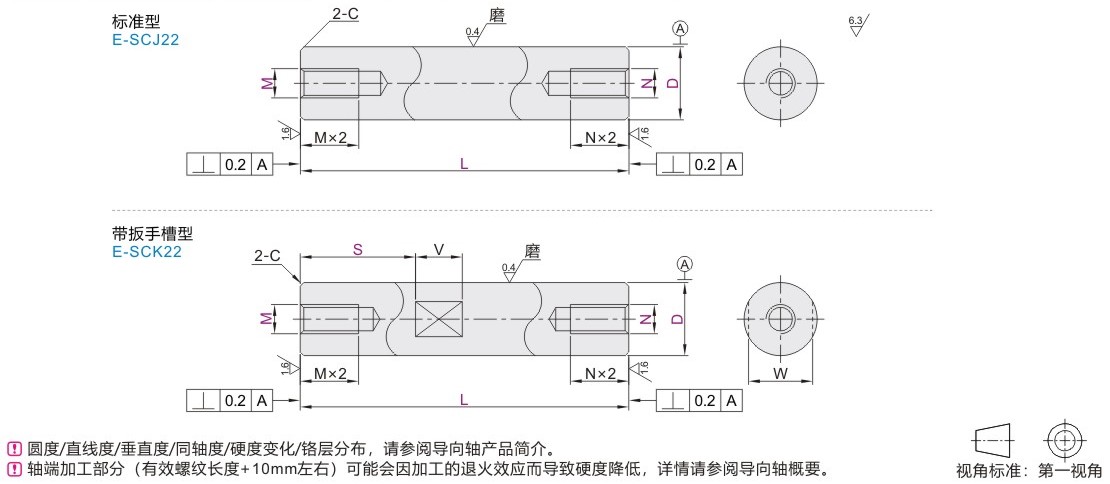E-SCJ22 | 两端内螺纹型 | 标准型 | 普通级 | 45 | S45C | 高频淬火 有效硬化层深度见P16 淬火硬度HRC58 ~ |