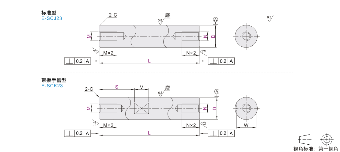 | E-SCJ23 | 两端内螺纹型 | 标准型 | 普通级 | 45 | S45C | 高频淬火 有效硬化层深度见P16 淬火硬度HRC56~ |