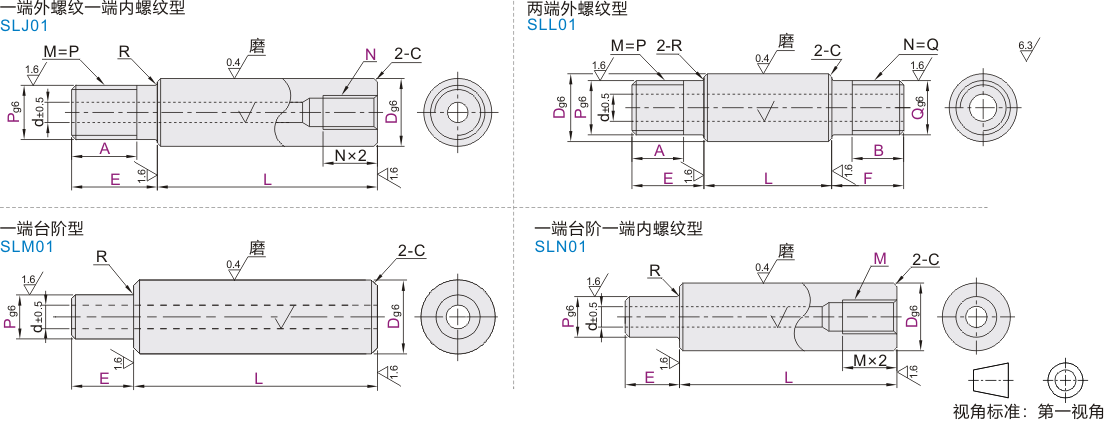 | SLJ01 | 一端外螺纹一端内螺纹型 | g6 | GCr15 | SUJ2 | 高频淬火 有效硬化层深度详情请在怡合达网站搜索查看 淬火硬度 GCr15 HRC56~ |