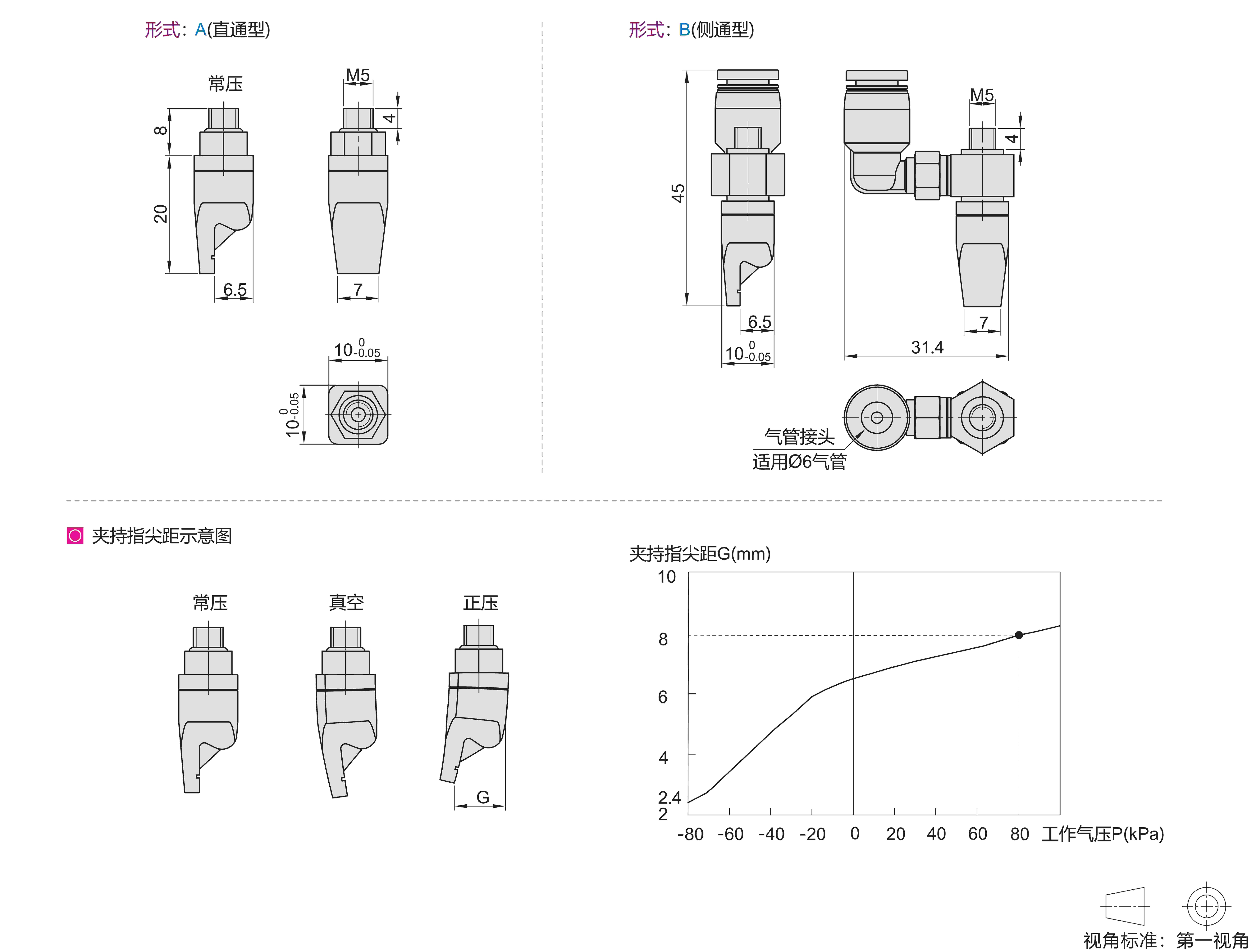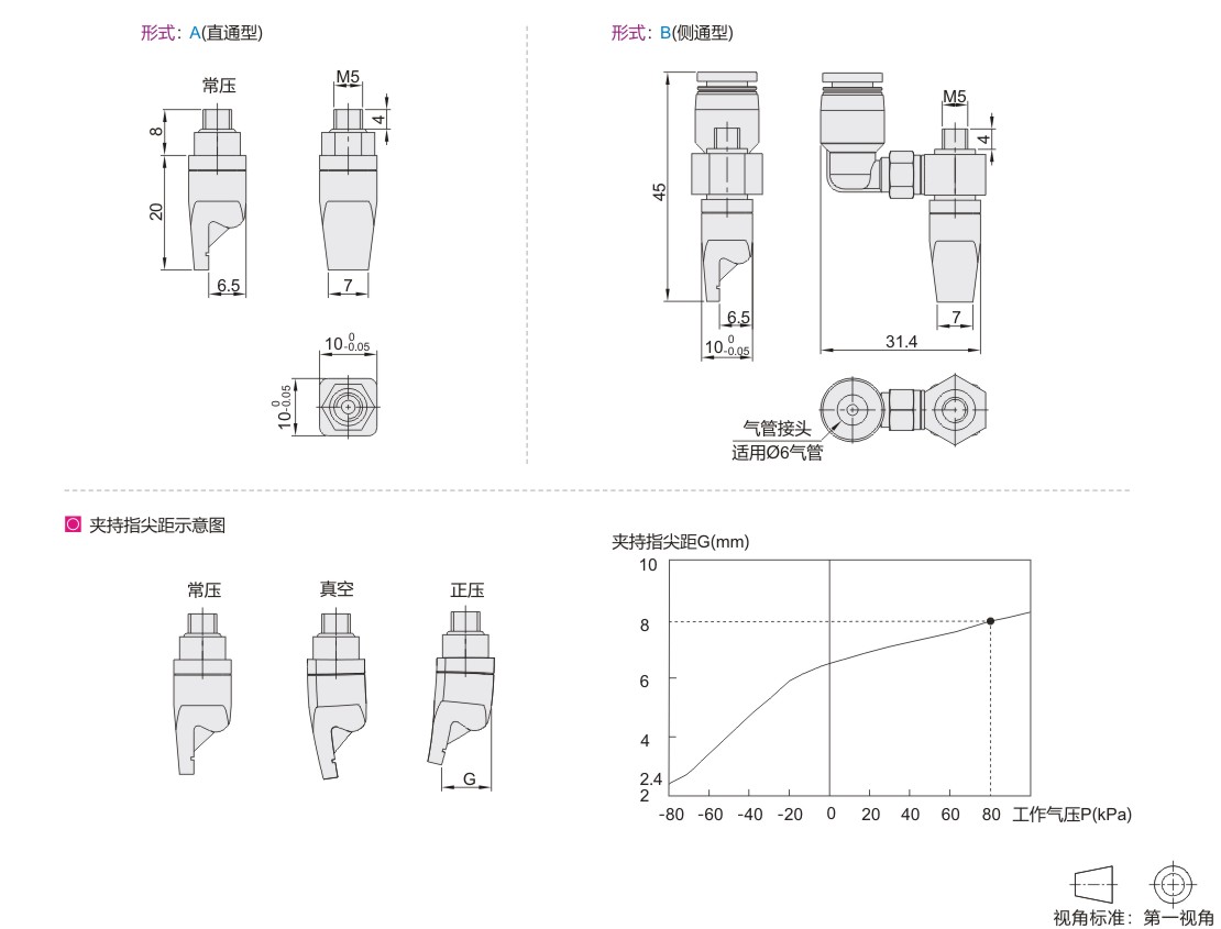 ● 正压状态指尖打开,真空状态夹紧,建议配合柔触空气驱动器使用,夹持指尖距G可使用工作气压调节;
