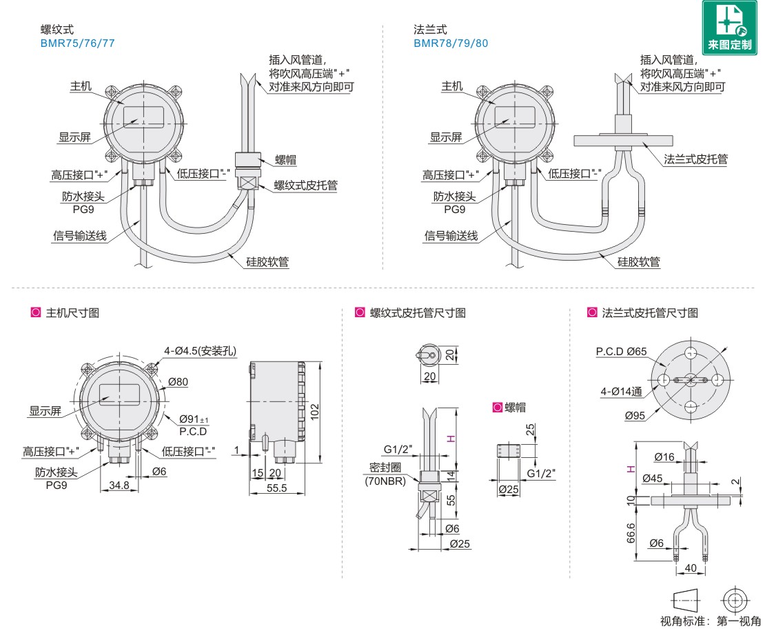 | BMR75 | 耐高温防堵型 | 高精密型 | 螺纹式 | 4~20mA/0~10V | ABS | SUS304 |