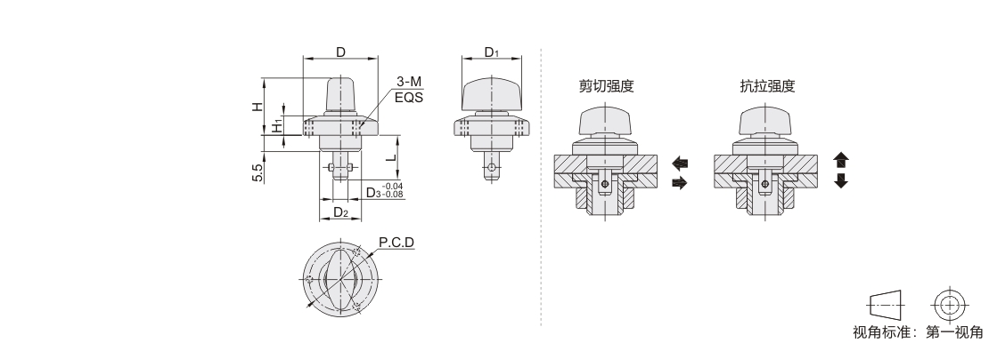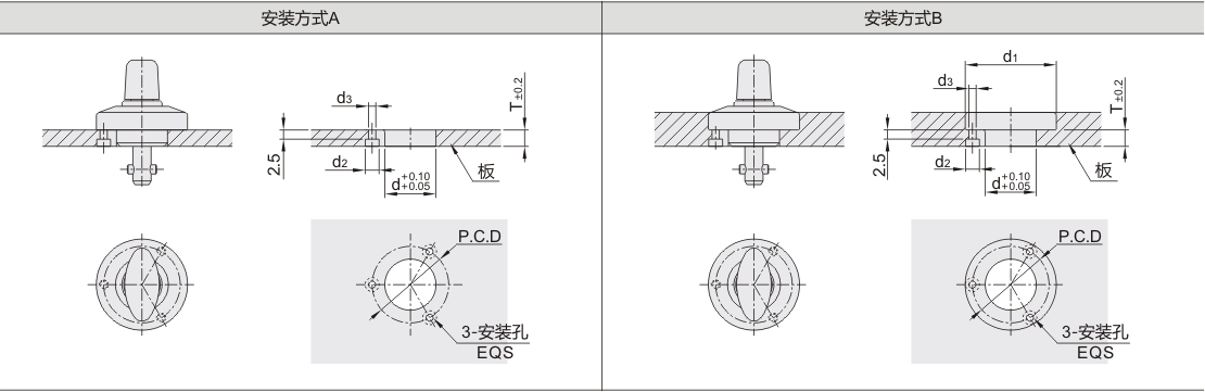 | 规格 | 适用板厚 | 安装方式 | d | d1 | d2 | d3 | P.C.D | T |