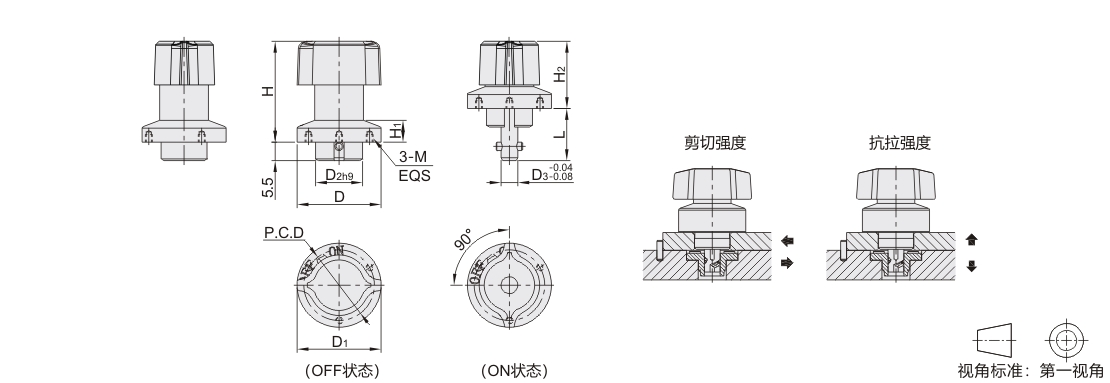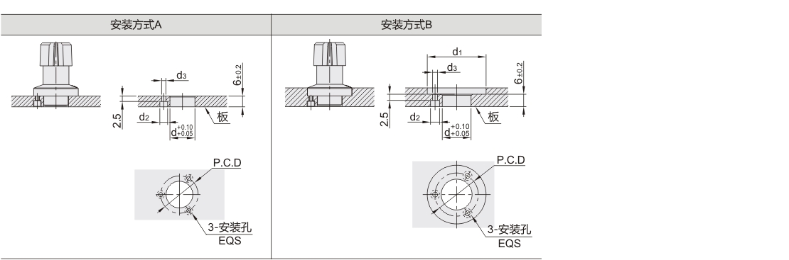 | 规格 | 适用板厚 | 安装方式 | d | d1 | d2 | d3 | P.C.D |