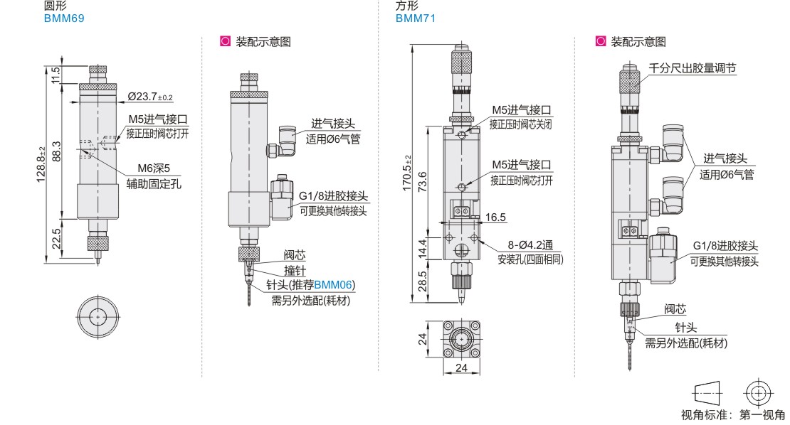 ● BMM69圆形撞针阀:采用单气控制,靠精密弹簧复位,出胶准确,断胶干净,在针头内封胶,不挂胶,无残留,适用于高精