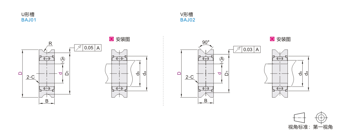 | BAJ01 | U形槽 | 双面带防尘盖式 | 9Cr18Mo | SUS440C | GB/T 307.1 0级 |