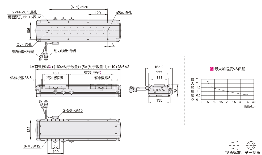 额定负载为加速度1G,速度1000mm/s,停顿1s,1000mm行程的水平安装理论值(仅作参考)。实际的额定负载受悬臂安装方式等影响,建议选型预留1.3倍以上的安全余量。