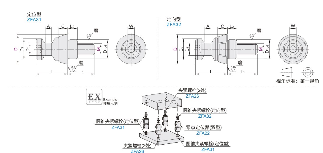 ● 工件的定位请与ZFA32圆锥夹紧螺栓(定向型)组合使用。