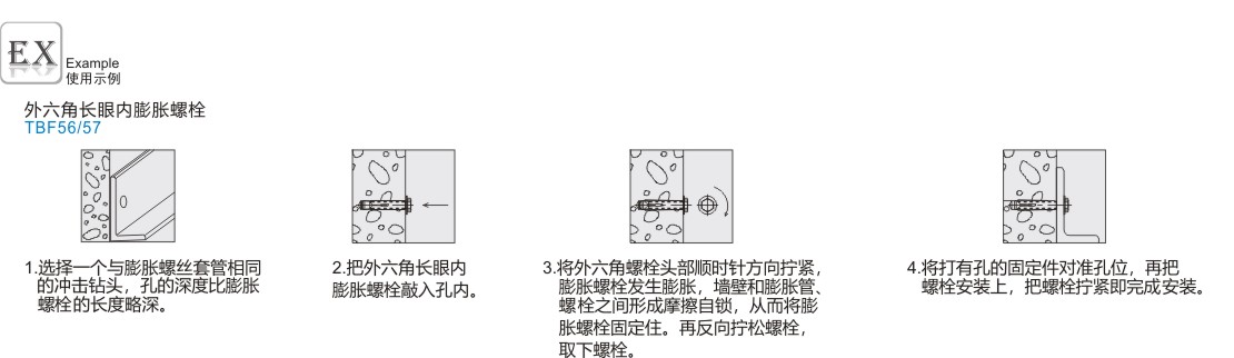| TBF56 | 外六角长眼内膨胀螺栓 | 碳钢 | 镀彩锌 | 4.8 | |