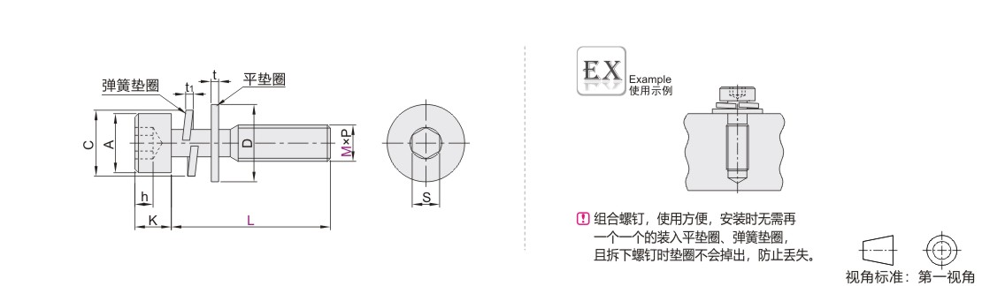 组合螺钉,使用方便,安装时无需再一个一个的装入平垫圈、弹簧垫圈且拆下螺钉时垫圈不会掉出,防止丢失。