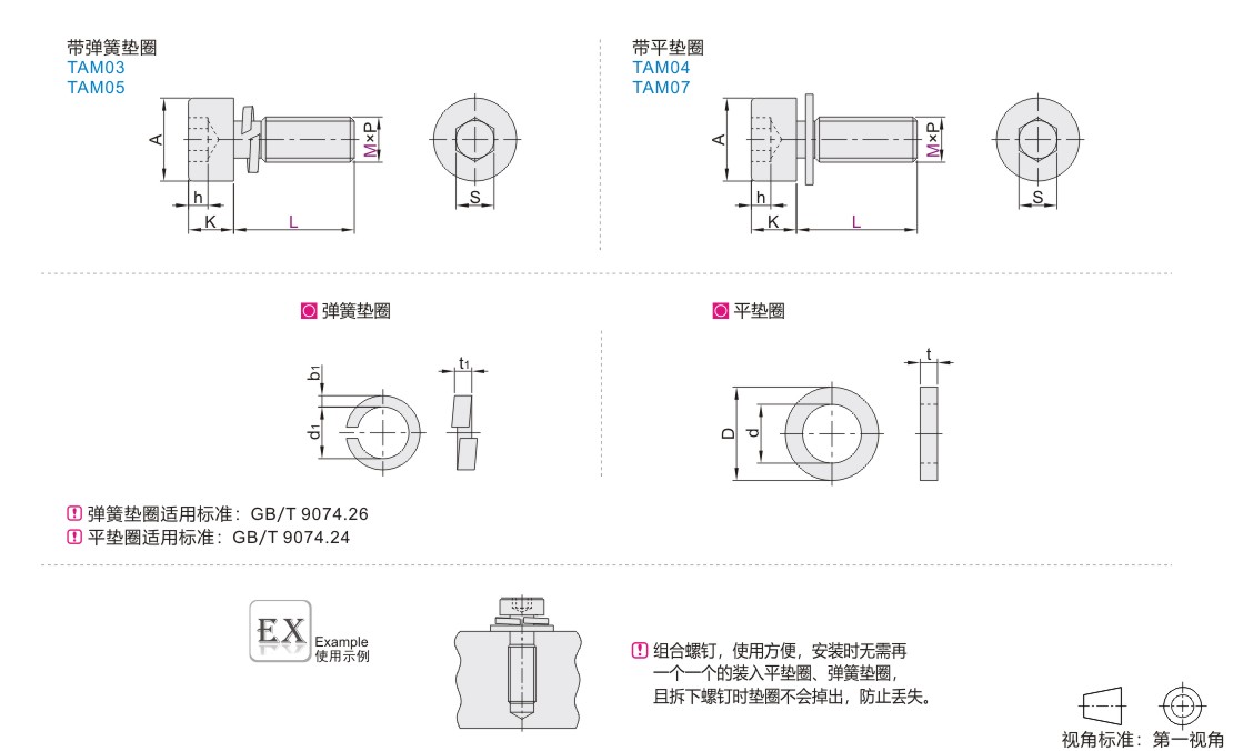 | TAM03 | 组合型 | 带弹簧垫圈 | 粗牙 | 35CrMo | SCM435 | 39~44HRC | 发黑 | 12.9 |