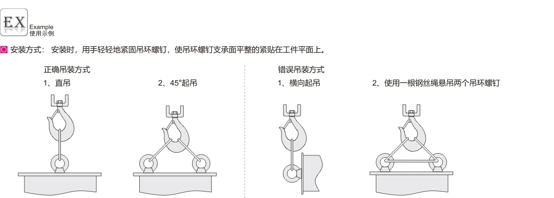 螺纹孔需要严格按照标准加工,安装前需要清理干净异物和灰尘,同时需要将螺纹完全拧入起吊工件或者设备,使得吊环本体完全贴合