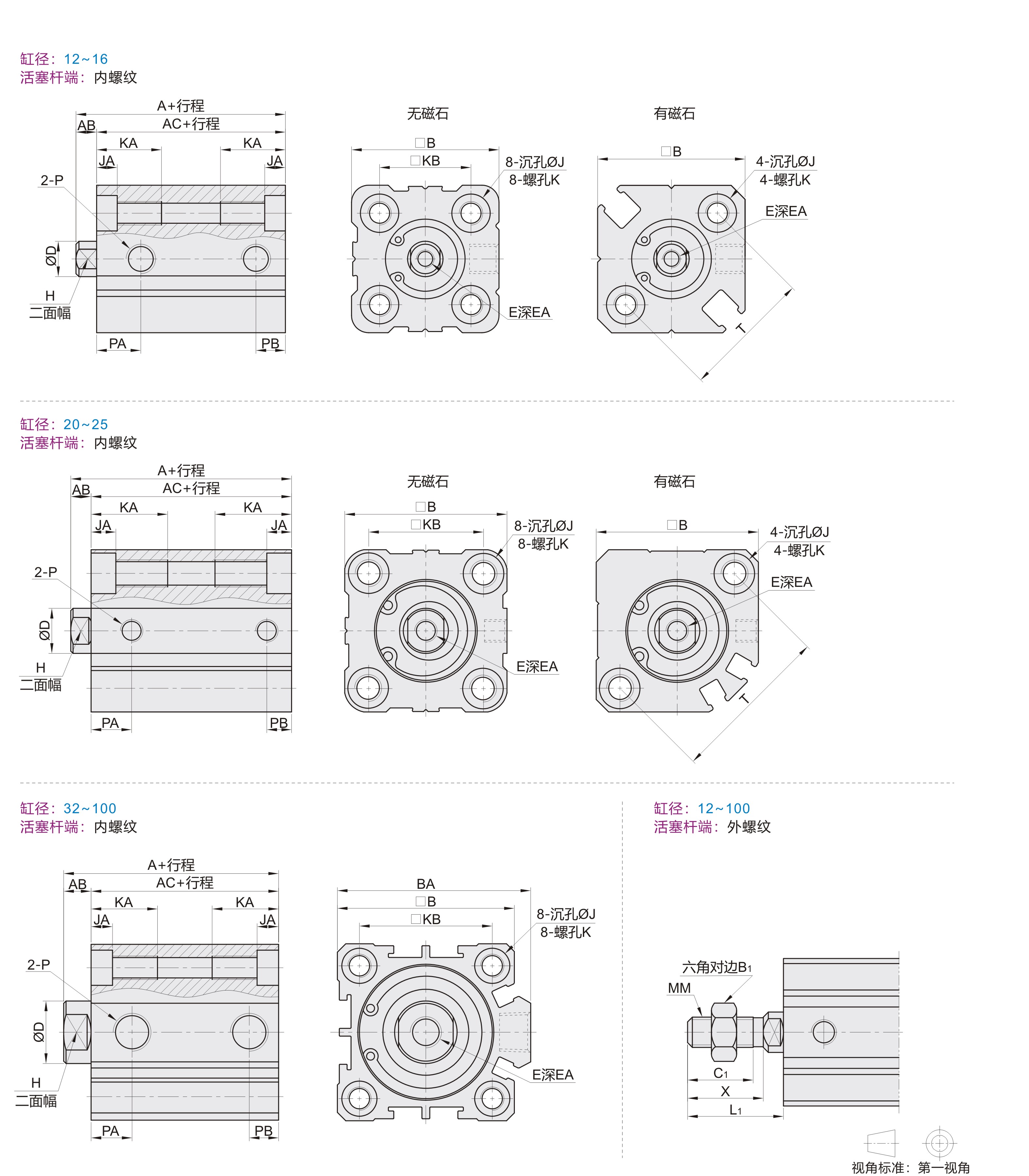 | 缸径 | J | JA | K | KA | KB | P | 无磁石 | 有磁石 | L1 | MM | C1 | X | B1 | |||