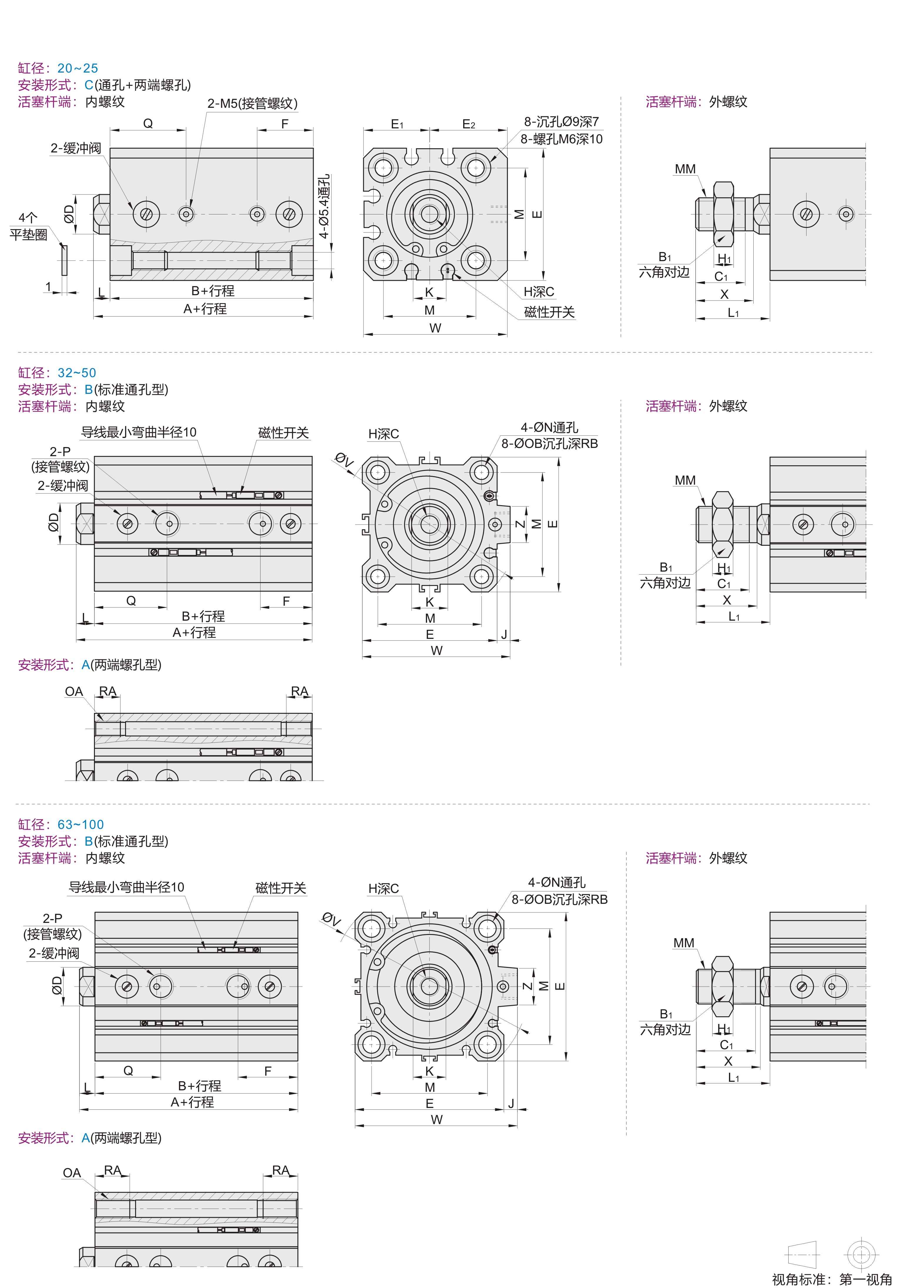| 缸径 | A | B | C | D | E | F | H | V | J | L | M | N | OB | P | Q | RB | W | Z | OA | RA | B1 | H1 | C1 | X | MM | L1 |