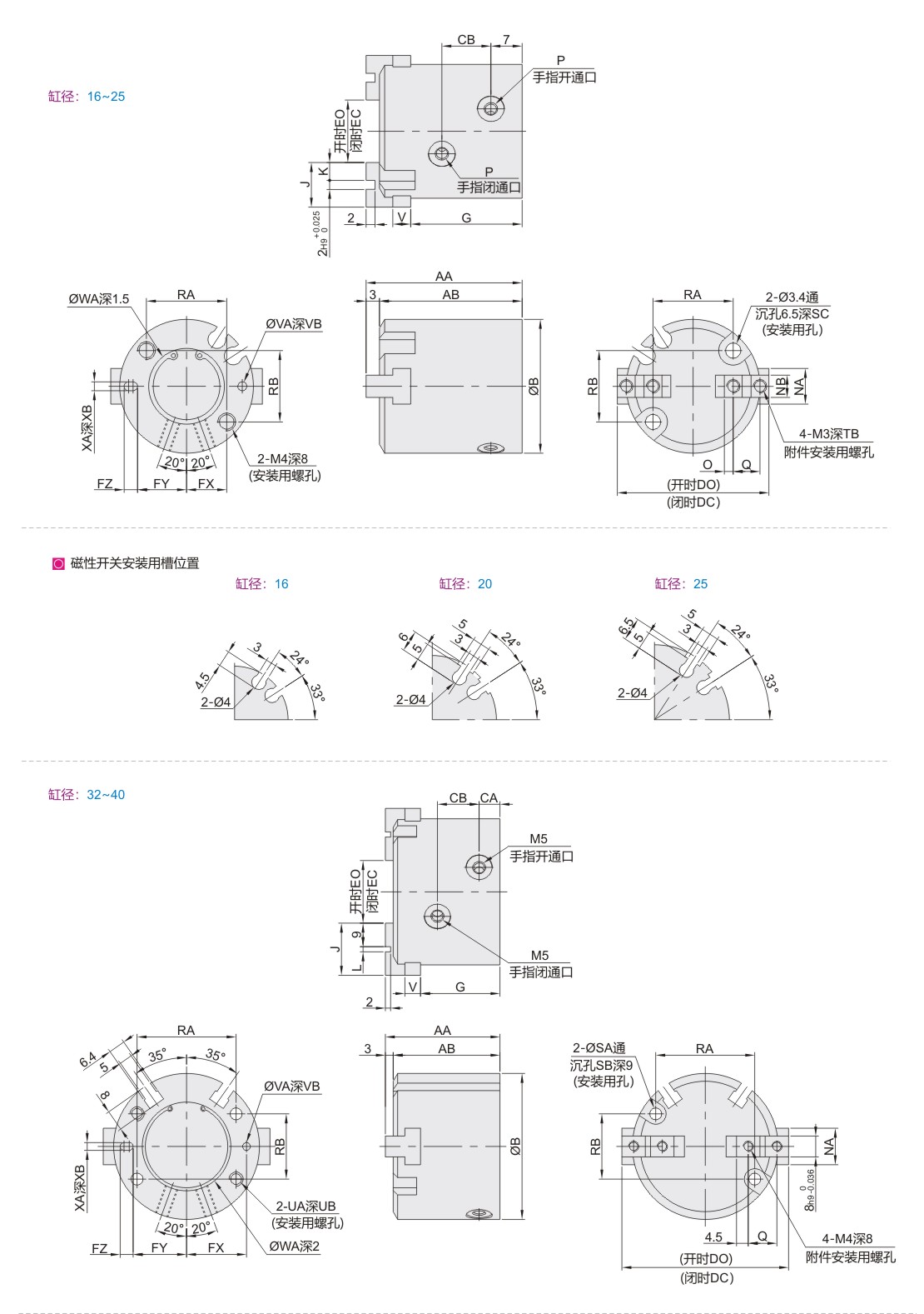 | 缸径 | O | P | Q | RA | RB | SA | SB | SC | UA | UB | TB | VA | VB | WA | WB | XA | XB | YC | ||||||||||||||||||||||||||||||||