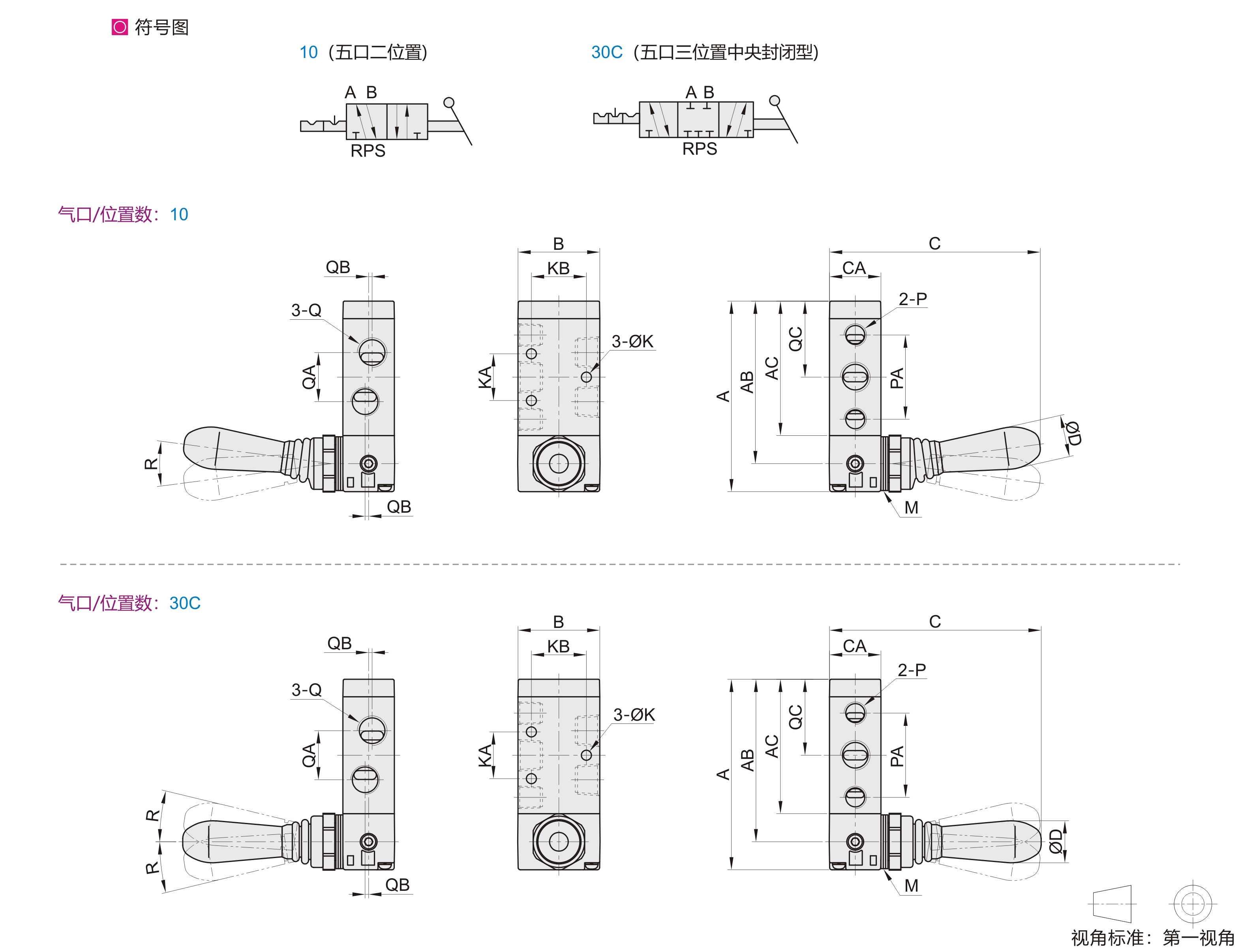 | 代码 | 系列 | 气口/位置数 | 接管口径 | A | AB | AC | B | C | CA | D | K | KA | KB | P | PA | Q | QA | QB | QC | R | M |