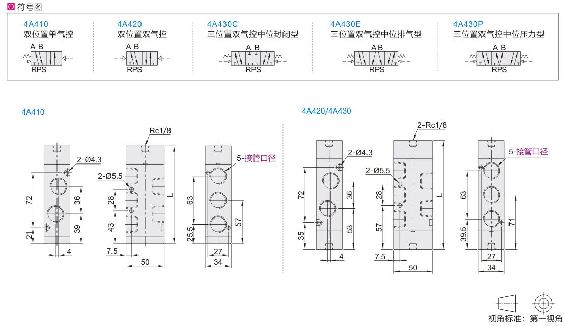 气控阀 五口二位/三位 4A400系列 外部气控式