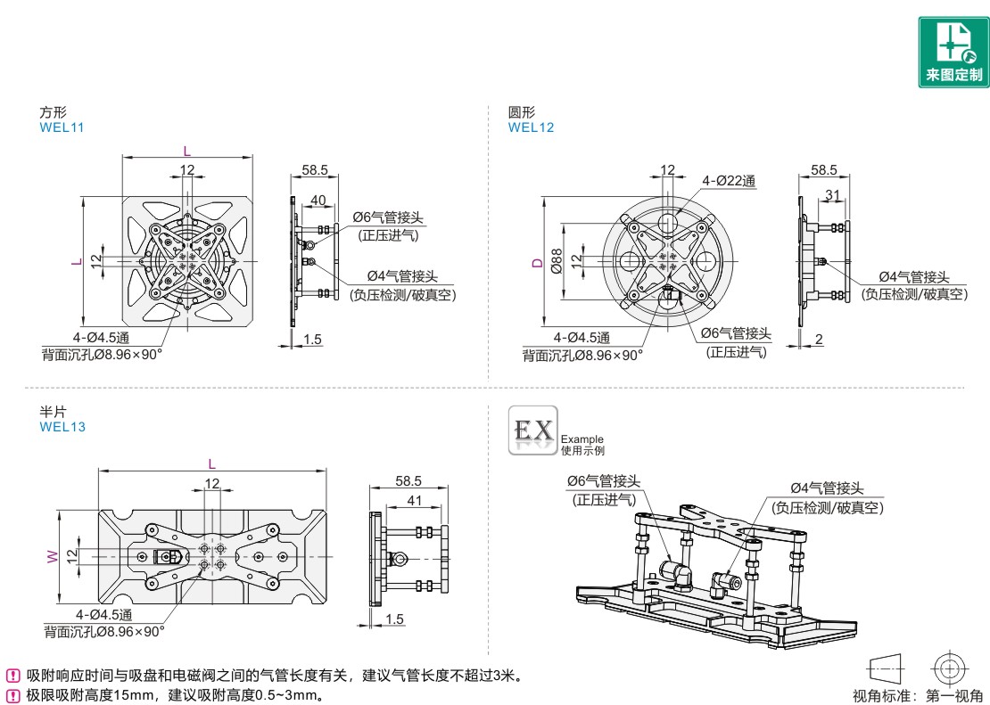 接入压缩空气即可工作,尤其适合于吸附搬运受压易损产品,吸盘自带双接头,