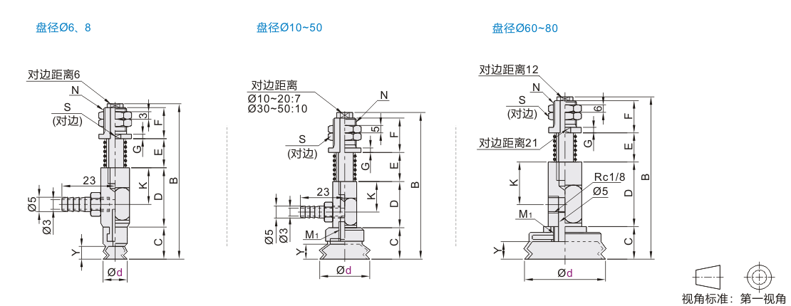 标准型 双层型真空吸盘 侧向配管型弹簧型 倒钩接头接管型