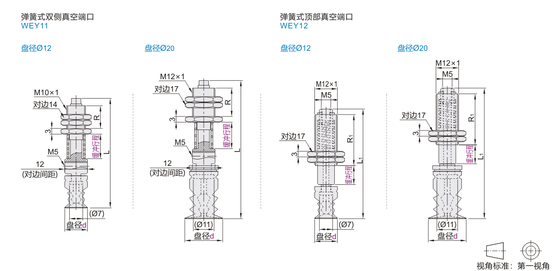 波纹轻型真空吸盘 组件 弹簧式双侧真空端口 弹簧式顶部真空端口 内螺纹接管型