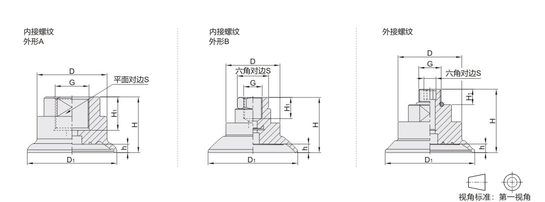 | 规格 | 螺纹 | D | H | H1 | G | D1 | S | h | 连接方式 | 外形 | 重量(g) | |||