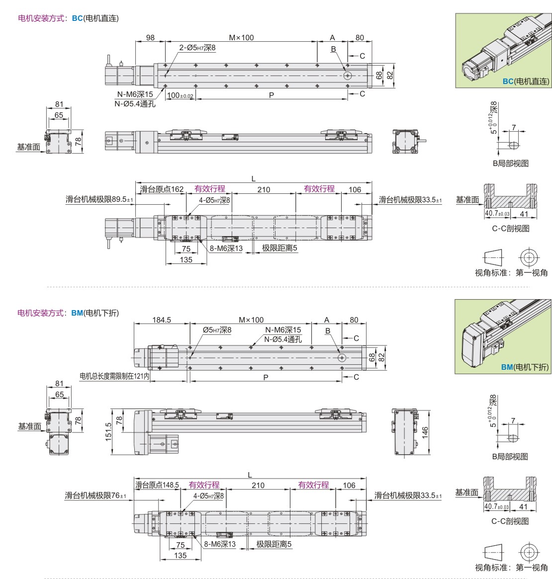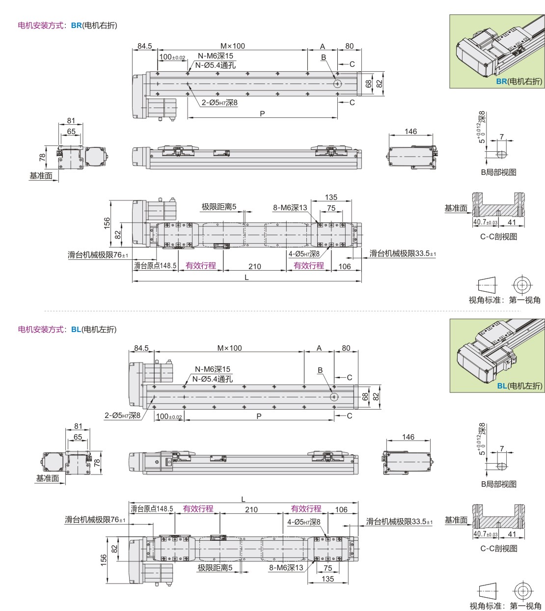 | Mx | 626N.m | 说明: 1.实际负载需满足以下条件: (a)满足"详细参数表"中最大负载条件 (b)满足"容许力矩表"中力矩条件 如超出条件使用将大幅降低滑台寿命 2.表中数据以额定寿命10000km为基准。 3.表中重复定位精度为单方向数值。 4.丝杠传动型滑台达到一定行程后,最高速度 需适当降低。以免滑台发生共振,影响使用 寿命。 5.滑台额定加速度0.3G,短行程滑台可能无法 达到最高速度。 6.滑台如果竖直使用,请选择带刹车电机。 |