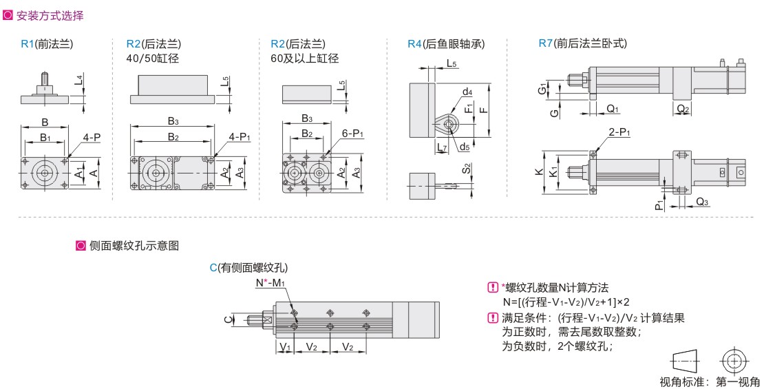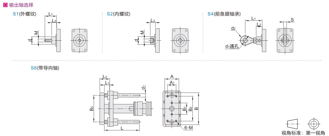 注2:S6(带导向轴)只能选择R2 (后法兰),R7(前后法兰卧式)、C(有侧面螺纹孔)三种安装方式中一种。